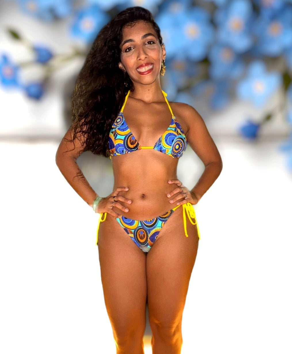 Bikini lacinho tradicional, estampa de olho grego, laço amarelo.